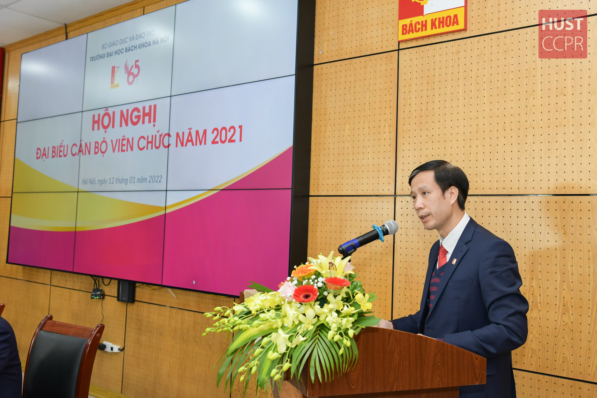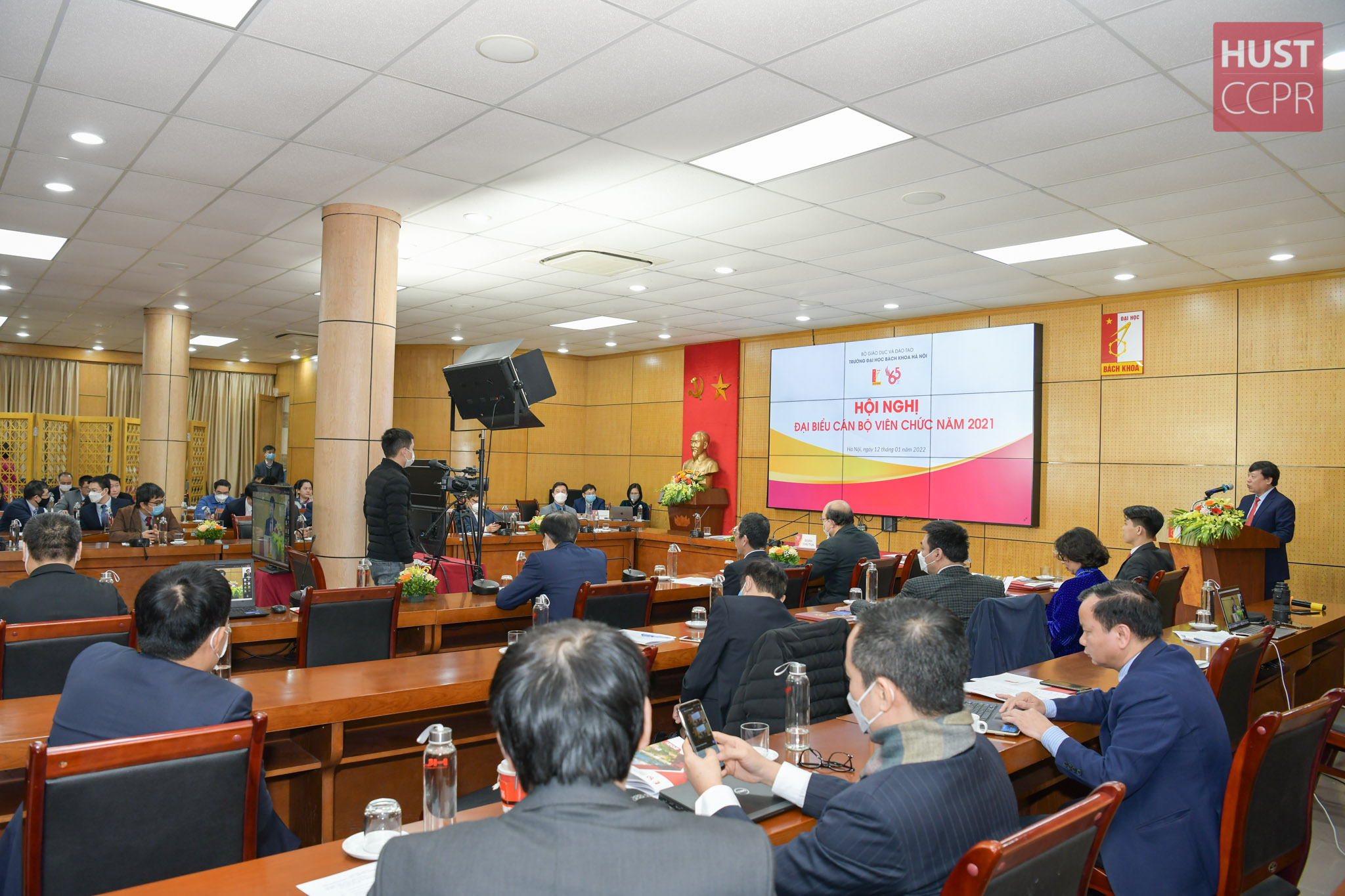 Hội nghị đã lắng nghe các báo cáo của Hiệu trưởng về kết quả thực hiện Nghị quyết Hội nghị CBVC năm 2020 và phương hướng hoạt động 2022 của Nhà trường; báo cáo của Hội đồng trường; báo cáo của Ban Thanh tra nhân dân Trường; Báo cáo tham luận về “Quốc tế hóa Đại học Bách khoa Hà Nội” của phòng Hợp tác đối ngoại.