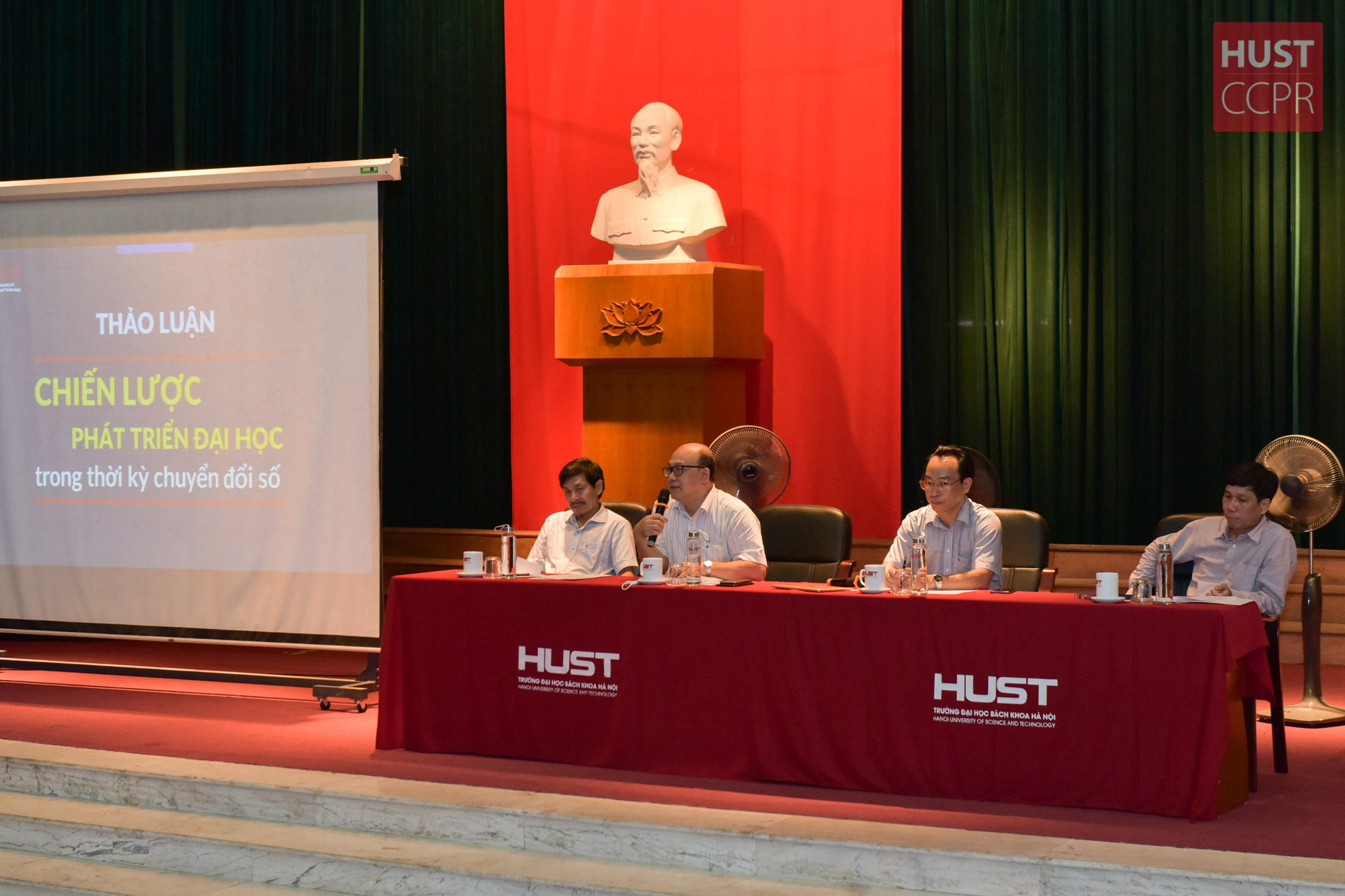 Từ trái qua phải, PGS. TS Trần Văn Tớp, PGS.TS Huỳnh Quyết Thắng, PGS.TS Hoàng Minh Sơn và GS.TS Đinh Văn Phong tại hội nghị tập huấn ngày 31/7 về chiến lược phát triển của Đại học Bách Khoa Hà Nội trong thời kỳ chuyển đổi số. Ảnh: Duy Thành.
