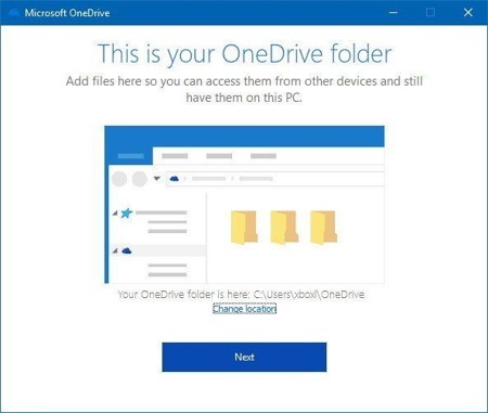 Bước 4: Màn hình gới thiệu về OneDrive sẽ xuất hiện. Tại đây sẽ có đường dẫn về thư mục OneDrive, nếu thư mục OneDrive đã tồn tại rồi bạn click vào Change location để thay đổi đường dẫn đến thư mục OneDrive nhằm tránh các đề rắc rối xảy ra khi đồng bộ hóa. Nếu không cần thay đổi bạn click Next để tiếp tục.