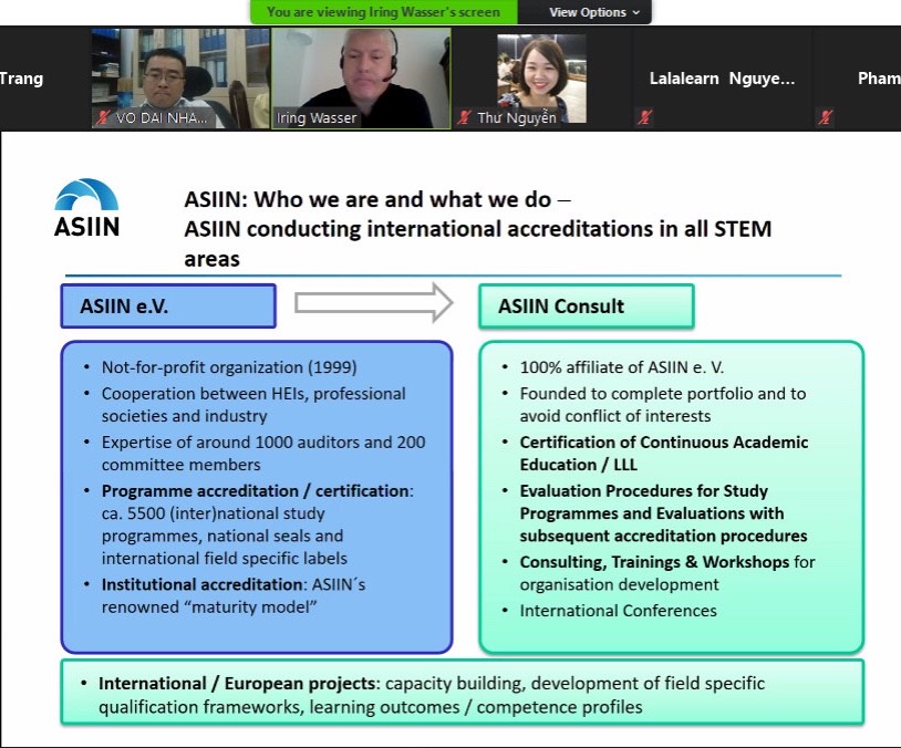 Trong buổi tập huấn, ông Iring Wasser, chuyên gia CHLB Đức, đã báo cáo, chia sẻ khái quát về tiêu chuẩn ASIIN, các nội dung và yêu cầu về đảm bảo chất lượng, bao gồm: các yêu cầu về chuẩn đầu ra, thiết kế và xây dựng chương trình đào tạo, xây dựng môn học; cấu trúc chương trình, lượng kiến thức và tín chỉ, phương pháp sư phạm, phương pháp trợ giúp người học; tổ chức thi, đánh giá sự tiến bộ và kết quả của người học; các nguồn lực phục vụ và dịch vụ hỗ trợ người học, các tiêu chuẩn về cán bộ; tính minh bạch, công bằng và các cải tiến, ĐBCL và nâng cao chất lượng.