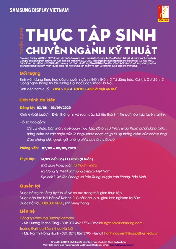 Chương trình Thực tập sinh HUST-SDV thông báo tuyển sinh viên năm cuối tham gia chương trình thực tập tốt nghiệp tại Công ty Samsung Display Vietnam: