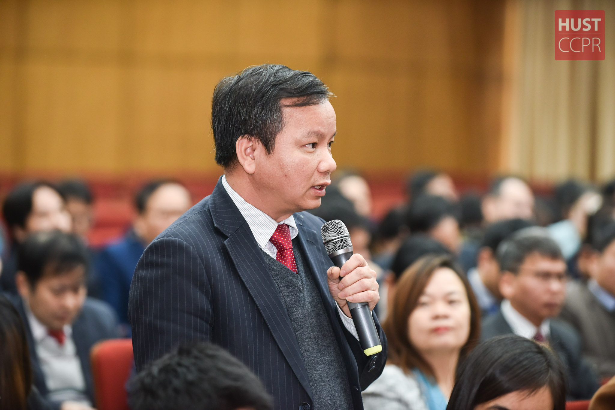 GS. Vũ Văn Yêm, Trưởng phòng Tổ chức Cán bộ, phát biểu ý kiến về việc nâng cao chất lượng chuyên môn và đời sống của đội ngũ cán bộ tại Hội nghị Cán bộ Viên chức năm 2020 diễn ra ngày 19/1 tại hội trường C2 Trường Đại học Bách khoa Hà Nội. Ảnh: Duy Thành.