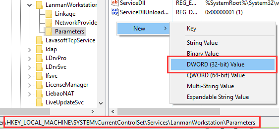 d. Điều hướng đến đường dẫn sau: HKEY_LOCAL_MACHINE \ SYSTEM \ CurrentControlSet \ Services \ LanmanWorkstation \ Parameters