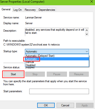 e. Chọn Automatic từ trình đơn thả xuống của menu Startup type.