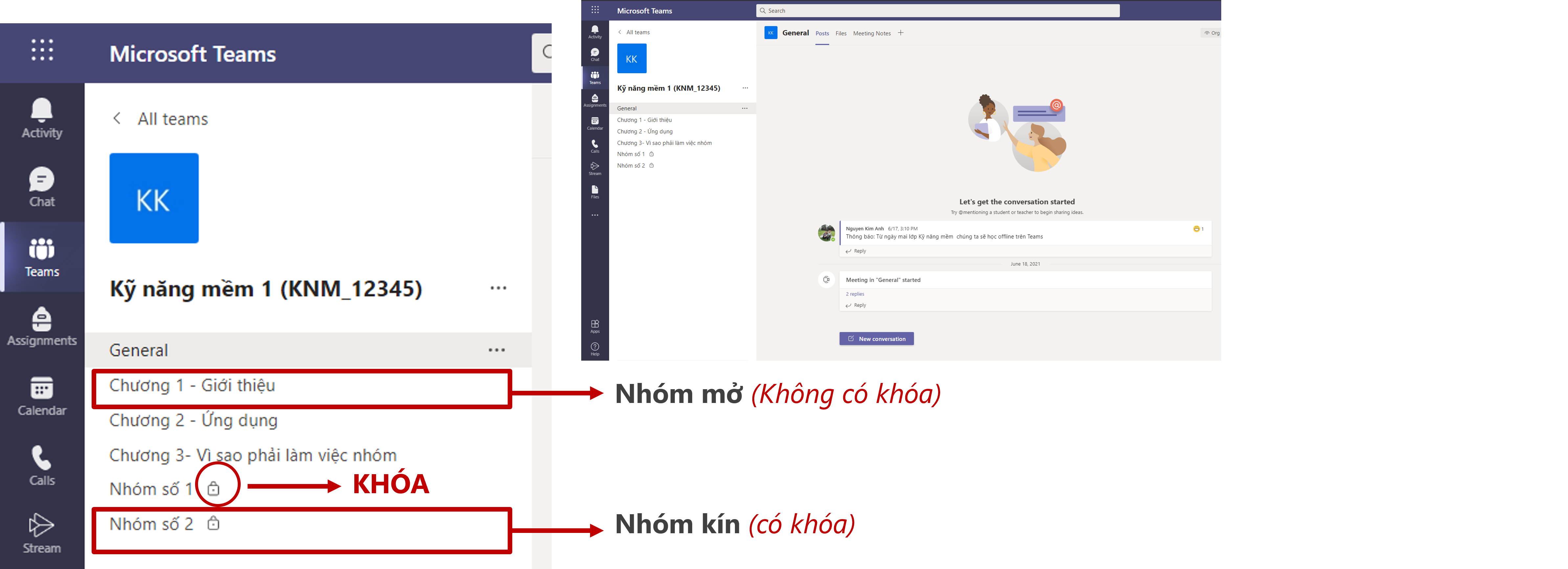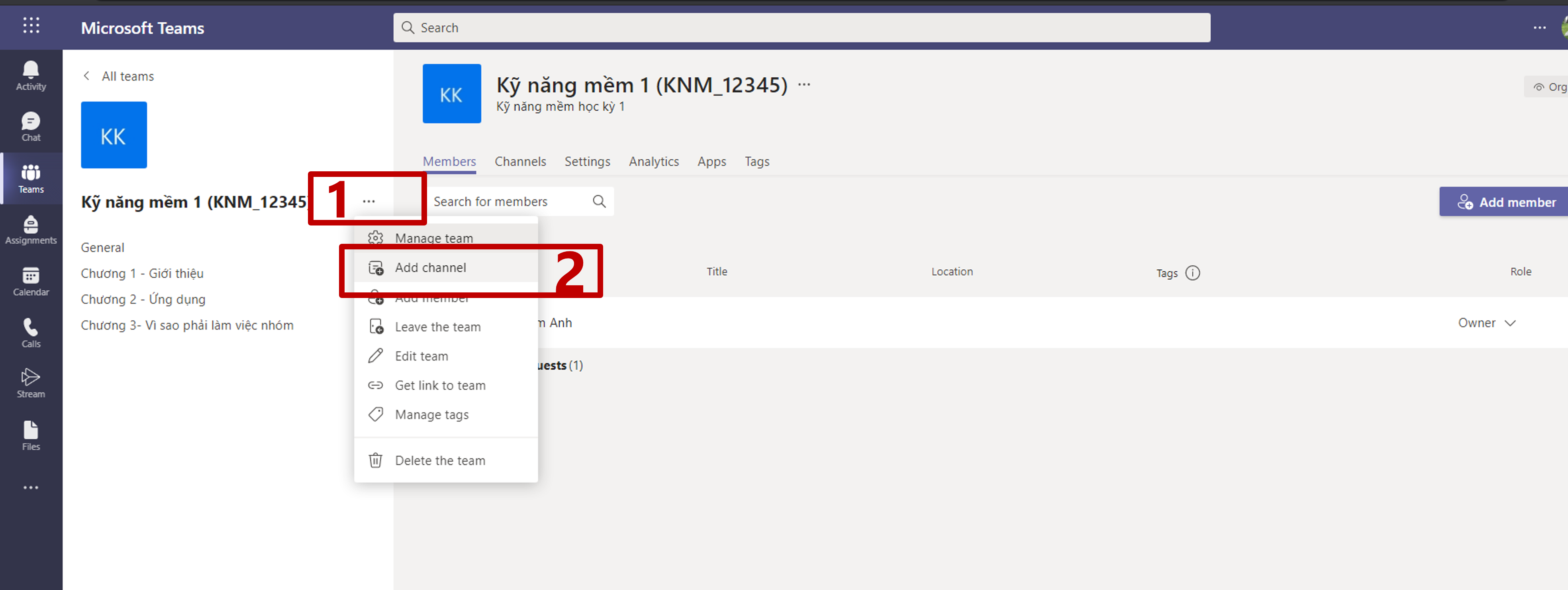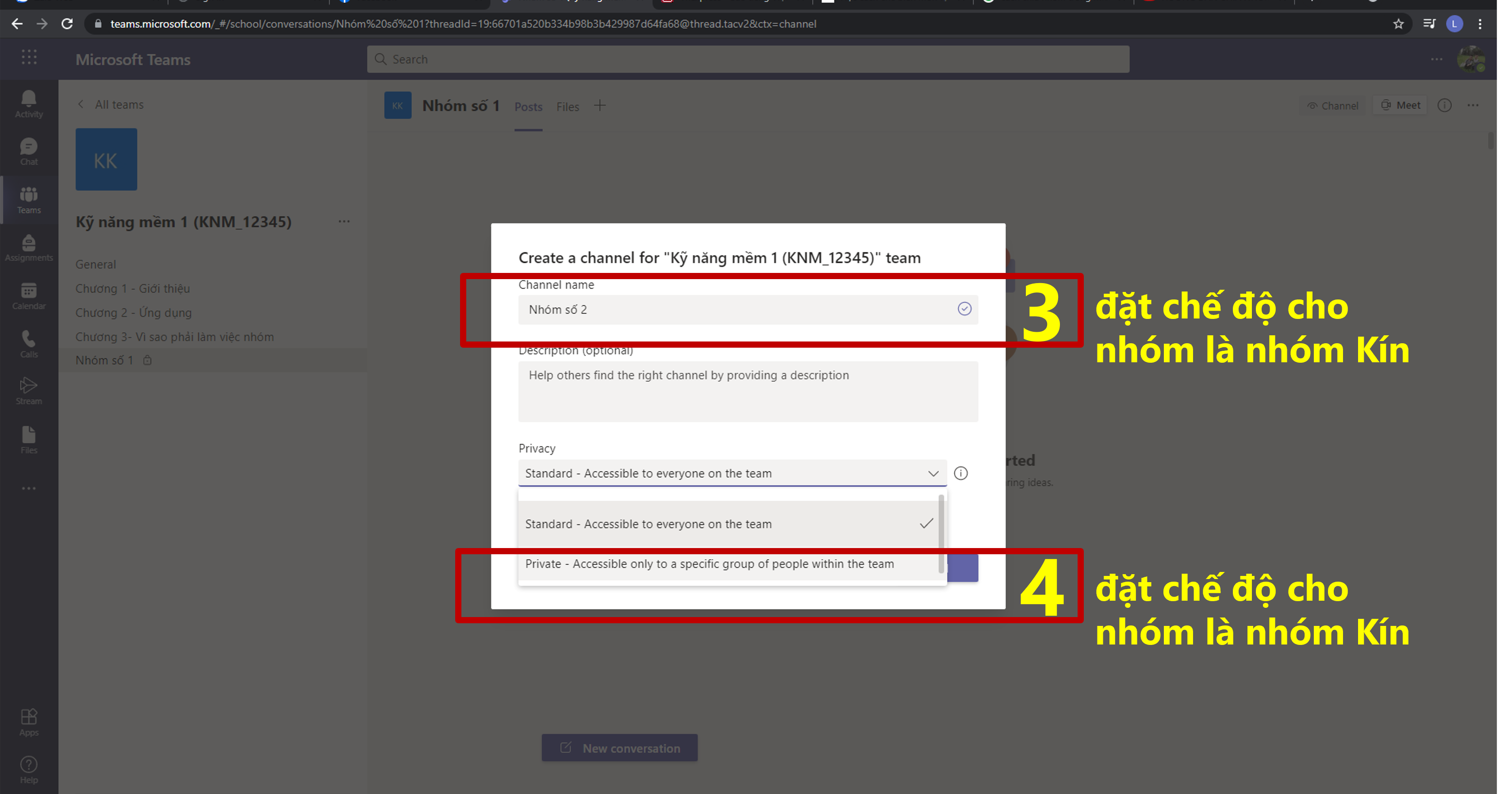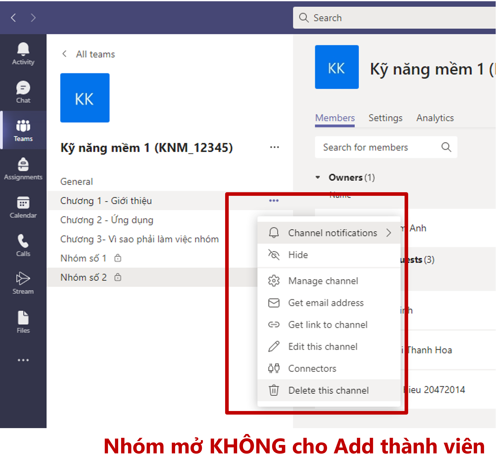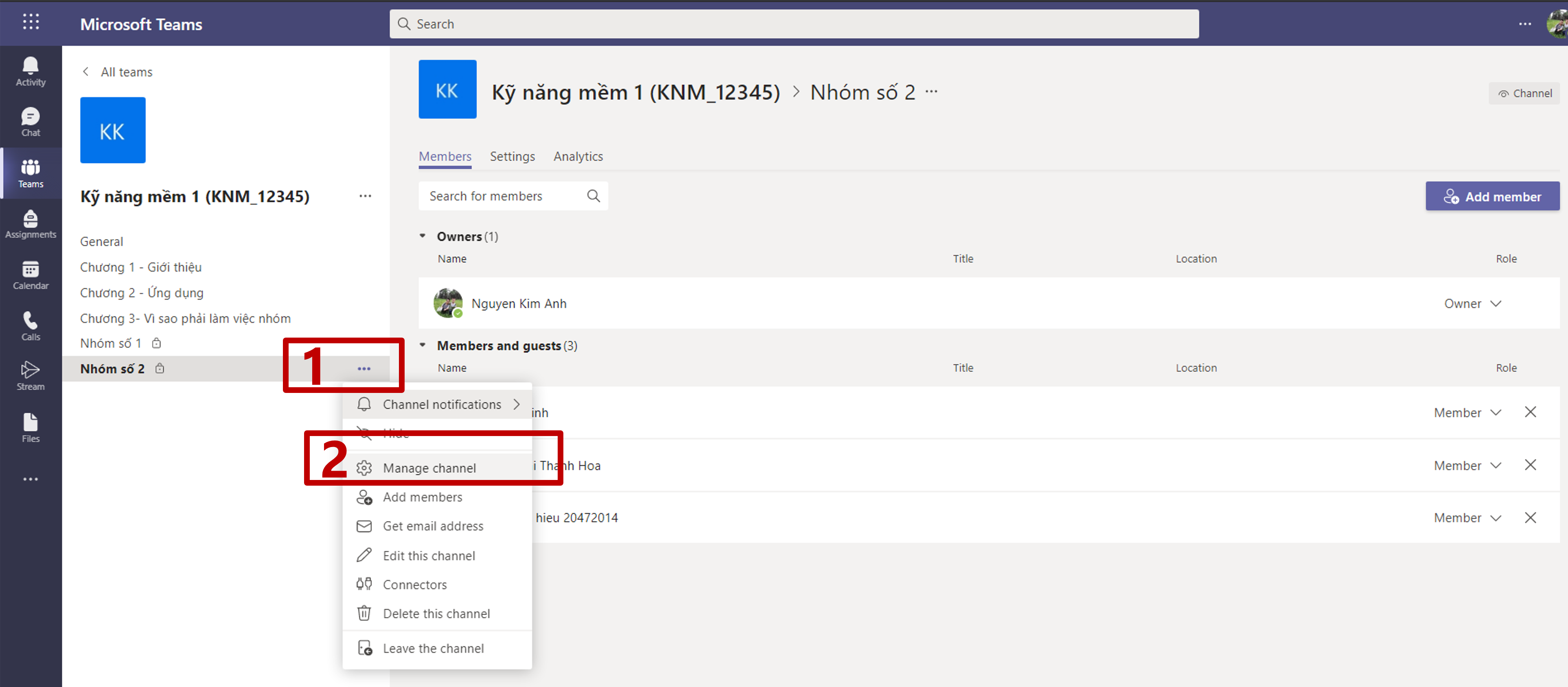 Ví dụ vào Nhóm số 2 vừa tạo chọn Manage channel