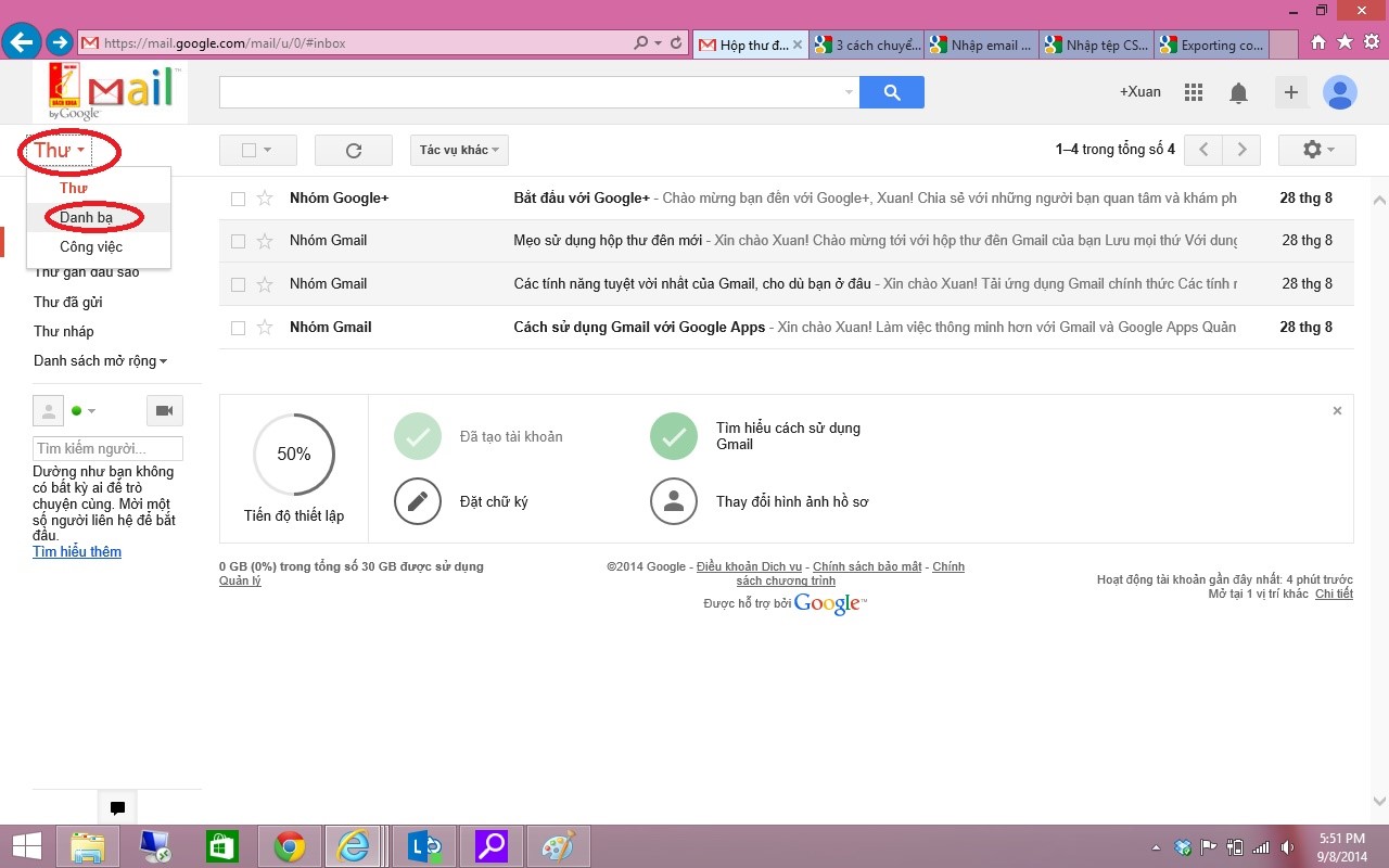 - Click vào mục “Thư” góc trên bên trái màn hình, Chọn “Danh bạ”