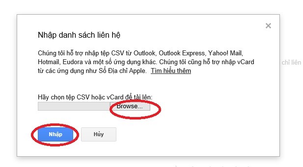 - Click “Browse”, Chọn File Địa chỉ, Click “Nhập”