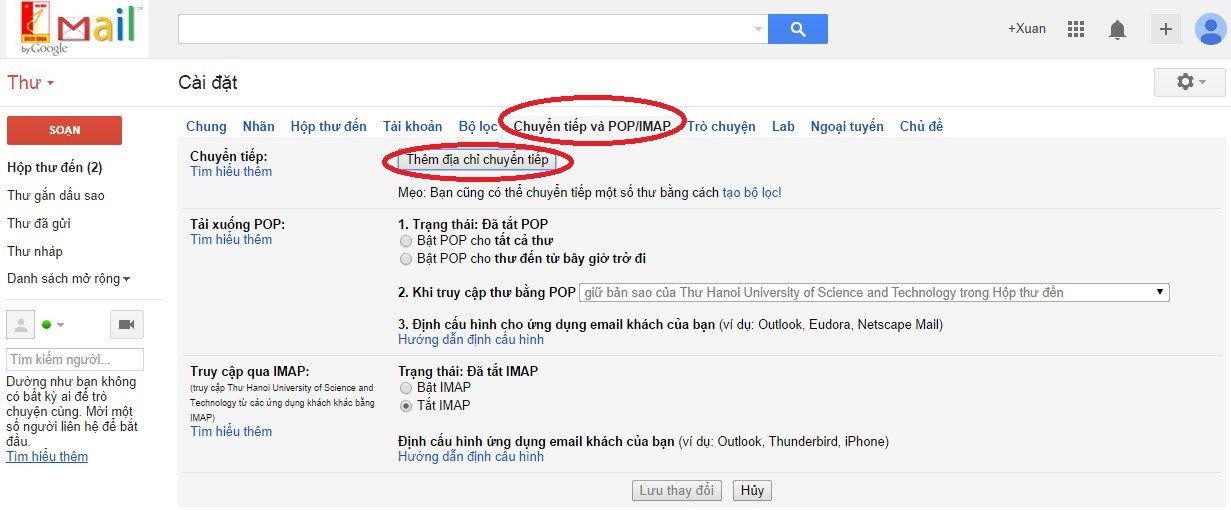 Bước 2: Chọn mục “Chuyển tiếp và POP/IMAP”, chọn mục “Thêm địa chỉ chuyển tiếp”