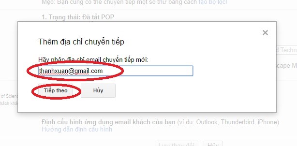 Bước 3: Thêm địa chỉ bạn muốn chuyển tiếp, Nhấn vào “Tiếp theo”