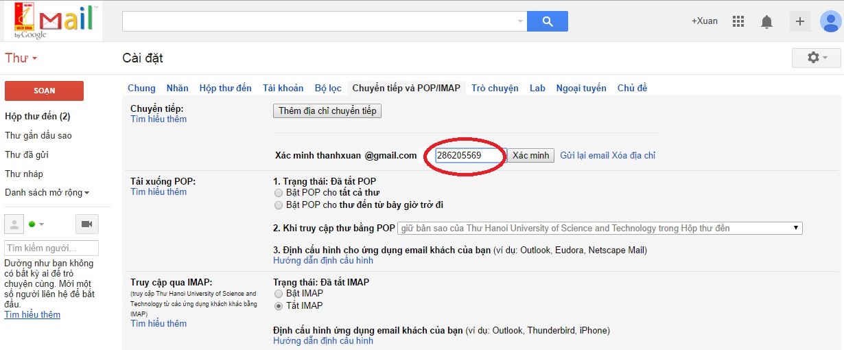 Bạn đăng nhập vào hòm thư muốn chuyển tiếp và mở thư chuyển tiếp, copy mã chuyên tiếp vào ô text cạnh “Xác minh”, sau đó click vào “Xác minh”
