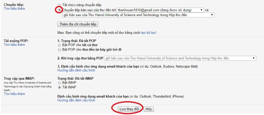 Bước 5: Trong mục “Chuyển tiếp”, Chọn “Chuyển tiếp bản sao của thư đến tới”, sau đó click vào “Lưu thay đổi” để hoàn tất việc chuyển tiếp thư