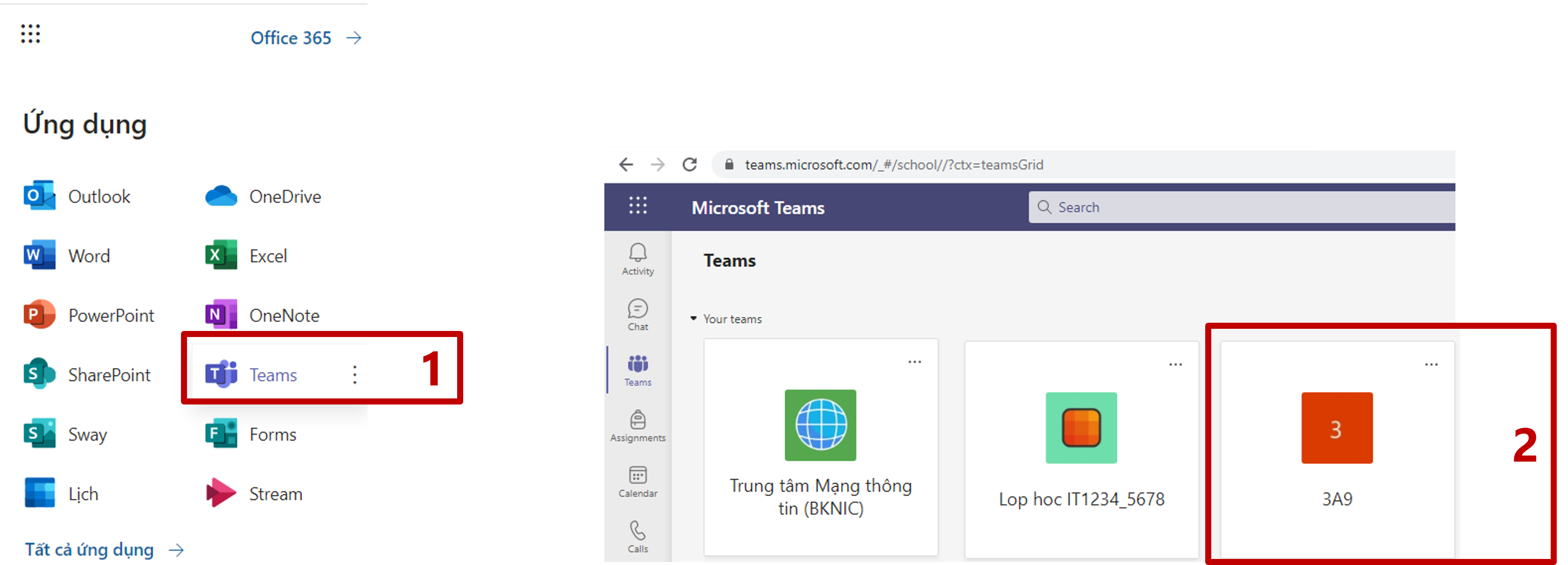 Bước 1, 2. Đăng nhập vào Teams và chọn lớp