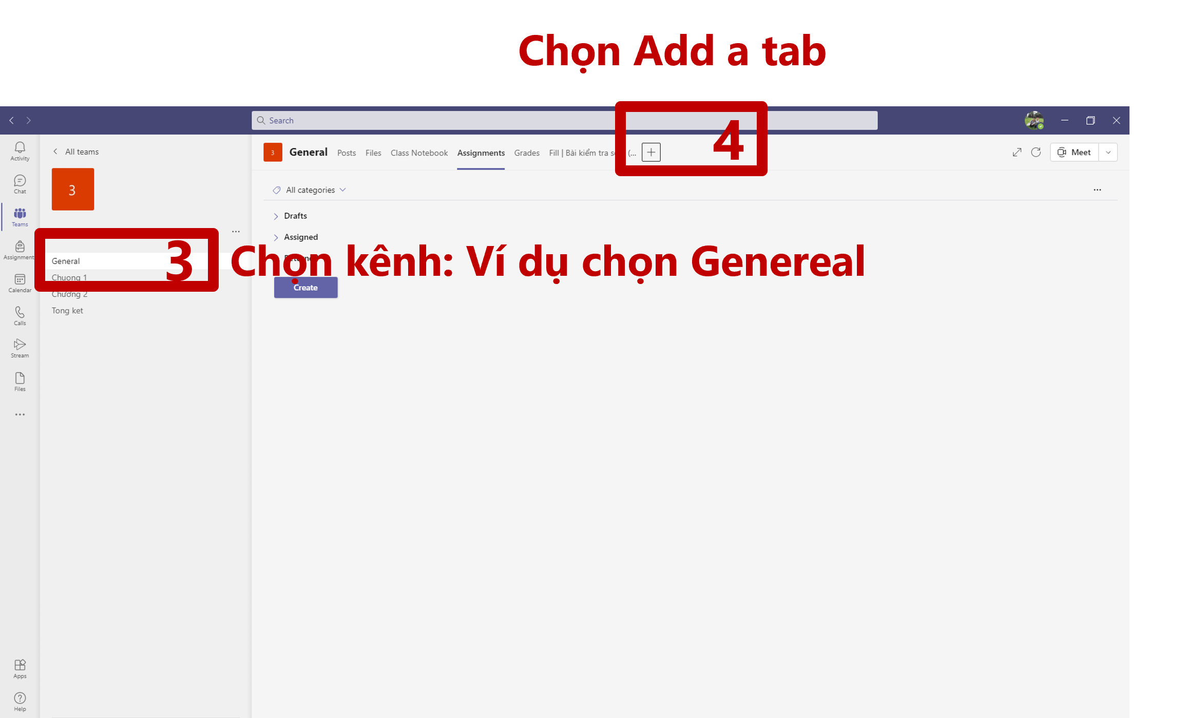 Bước 3, 4: Chọn kênh (ví dụ General) sau đó chọn Add a tab