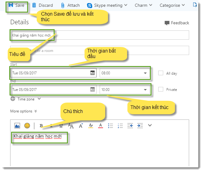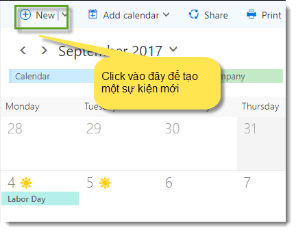 Calendar là một ứng dụng của Office 365 cho phép tạo các sự kiện, ghi chú nhắc nhở cá nhân và tạo các yêu cầu họp.