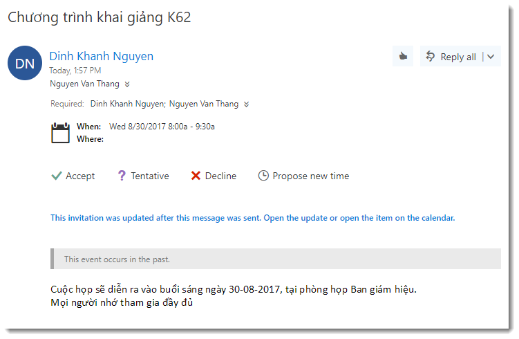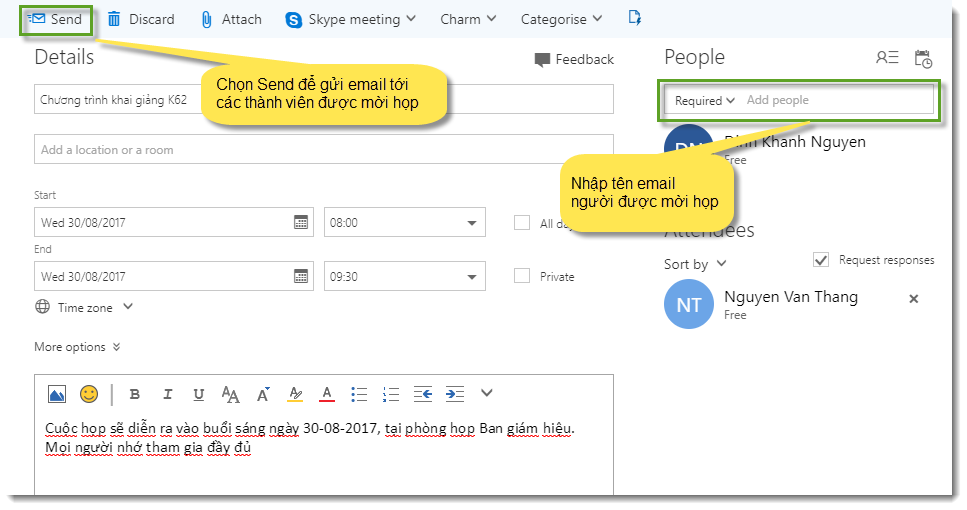 Để tạo một yêu cầu họp, ta thực hiện như các bước tạo một sự kiện, sau đó add thêm người được yêu cầu họp, sau đó chọn “Send” để gửi tới các thành viên để mời họp