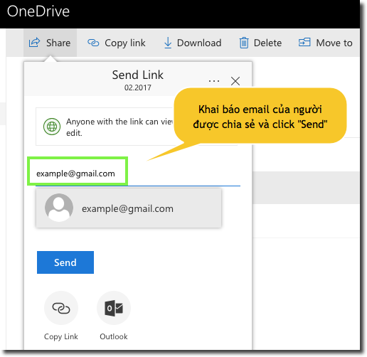 Khai báo email của người được chia sẻ tào liệu, chọn can view nếu muốn người được chia sẻ chỉ có quyền đọc file, chọn can edit nếu muốn người đó có thể sửa file. Click "Send".