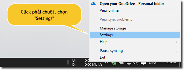 Click phải chuột vào biểu tượng OneDrive, chọn Settings.