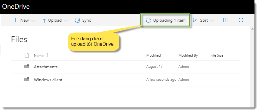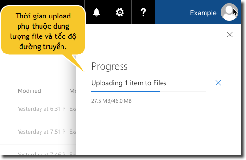 Thời gian upload tùy thuộc vào dung lượng file và tốc độ đường truyền, sau khi upload xong, file mới sẽ được nhìn thấy trên Onedrive. Kích thước tối đa một file có thể upload lên OneDrive là 10GB.
