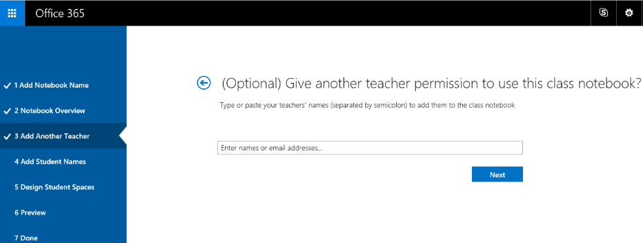 Sau khi chọn Next ở bước trên, tiếp tục đến phần bạn có thể chia sẻ notebook của mình với những giảng viên khác hoặc nhân viên trong tổ chức nội bộ. Mặc định có thể không chọn thì có thể click Next để bỏ qua bước này.