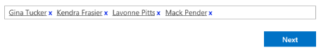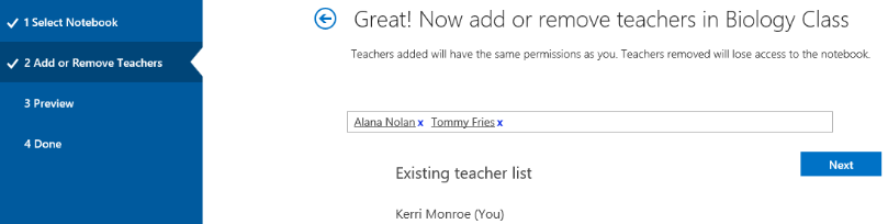 Bạn có thể thêm một hoặc nhiều giảng viên bằng cách gõ tên họ ở đây, Trong trường hợp này chẳng hạn, nhập tên hai giảng viên và sau đó click hoặc tap Next.