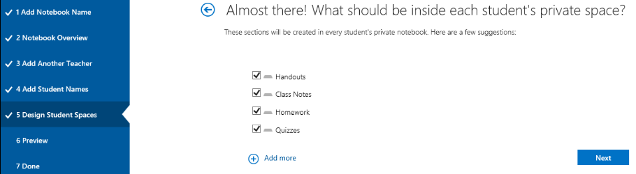 Student notebook chứa một số section mặc định. Bạn có thể thêm các section cộng thêm, hoặc đơn giản chỉ cần click hoặc tap Next để đồng ý với những sự gợi ý.