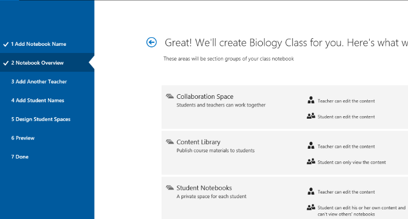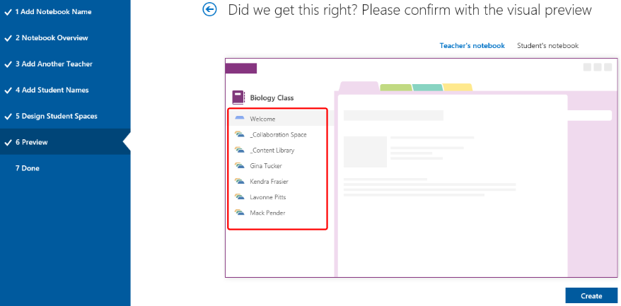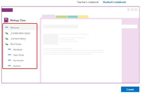 Trước khi bạn tạo class notebook, bạn được cung cấp chế độ xem trước. Teacher’s notebook là những phần section của notebook mà giảng viên sẽ nhìn thấy được, còn Student’s notebook là những phần section của notebook mà sinh viên sẽ nhìn thấy được. Click hoặc tap để tạo.