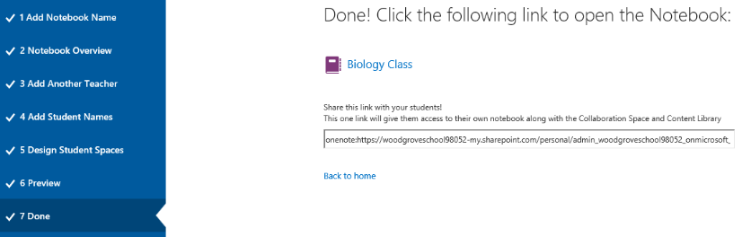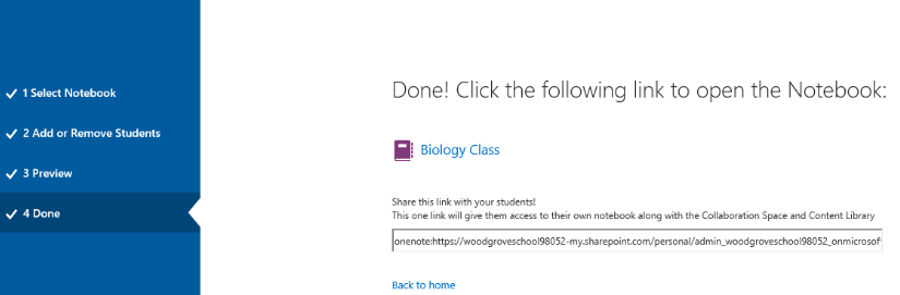 OneNote bắt đầu chạy và cấu hình phân quyền cho notebook của giảng viên và mỗi notebook của sinh viên. Khi quá trình khởi tạo hoàn thành, bạn sẽ thấy một liên kết đến class notebook mới. Gởi đường link này đến các sinh viên của bạn để họ truy cập vào notebook. Bạn cũng có thể mở notebook trực tiếp từ đây.