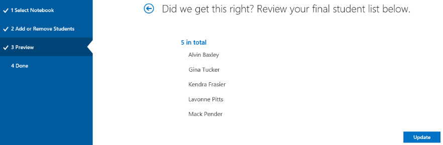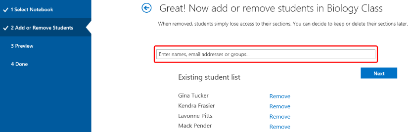 Trong trường hợp này có nhiều hơn một group, chúng ta có thể thêm từng sinh viên riêng lẻ. Nhập tên của các sinh viên. Mỗi sinh viên sẽ được gán student notebook của họ trong class notebook.