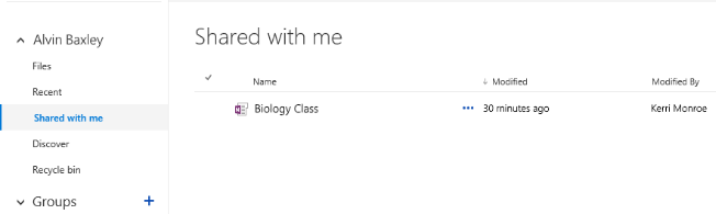 Họ cũng có thể truy cập đến qua folder “Shared with me” trên OneDrive. Tại đây, các sinh viên sẽ tìm thấy bất kỳ OneNote Class Notebook đã gán cho họ, cũng như các tài liệu được chia sẻ khác mà họ có thể truy cập vào.