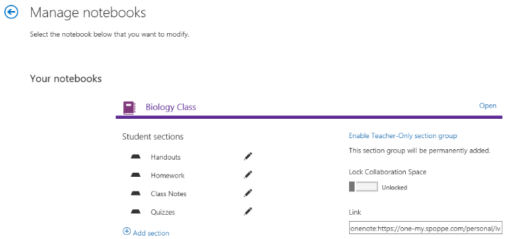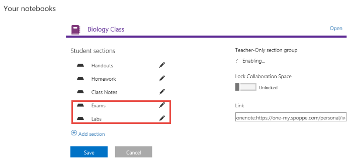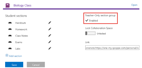 Bạn có thể thêm một nhóm section chỉ dành cho giảng viên trong notebook, là một không gian riêng mà chỉ có giảng viên thấy được bằng cách click hoặc tap Enable Teacher-Only section group. Hoặc nếu tại bất kỳ thời điểm nào bạn muốn ngăn không cho sinh viên chỉnh sửa nội dung trong Collaboration Space, chỉ việc click hoặc tap Lock Collaboration Space để khóa lại.