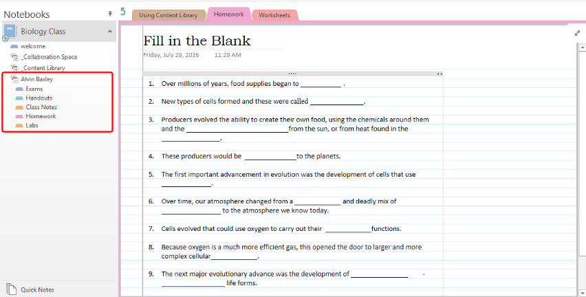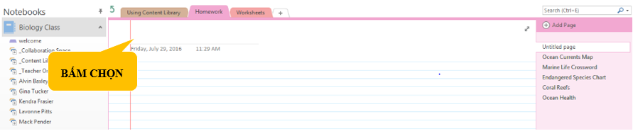 Chú ý là mỗi sinh viên chỉ có thể thấy notebook cá nhân của mình và không thấy notebook của các sinh viên khác. Sinh viên thao tác làm bài tập về nhà từ Content Library là phần chỉ đọc, nhưng trước tiên phải sao chép trang công việc bàn giao vào notebook cá nhân của mình trước khi có thể thực hiện.