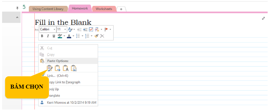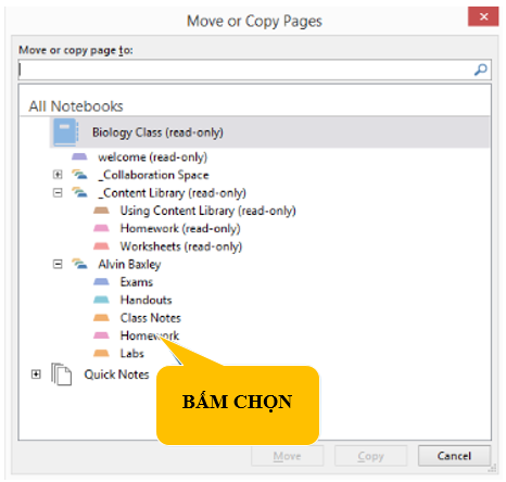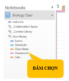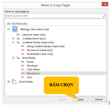 Chọn vị trí trong student notebook để sao chép công việc bàn giao. Trong ví dụ này là Homework.