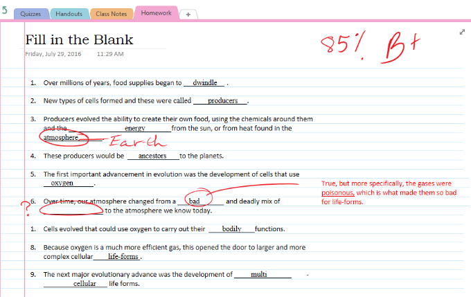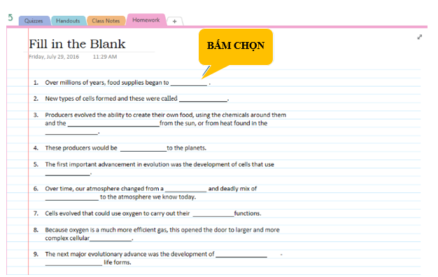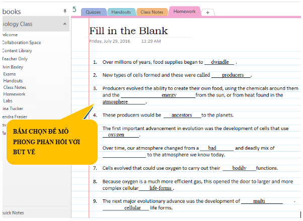 Sinh viên có thể điền trả lời ngay trong trang, và OneNote lưu lại những công việc của sinh viên đó thực hiện.