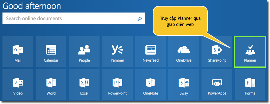 Truy cập Microsoft Planner qua giao diện web tại địa chỉ https://portal.office.com/