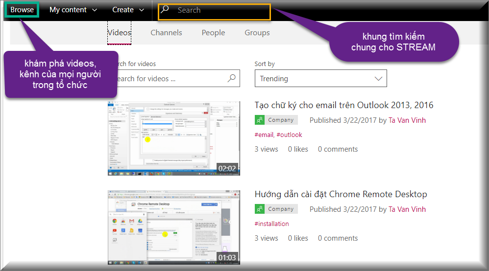 Stream là giải pháp video business của Microsoft. Nó giống như hệ thống Youtube nổi tiếng của Google dành riêng cho nội bộ tổ chức của bạn.