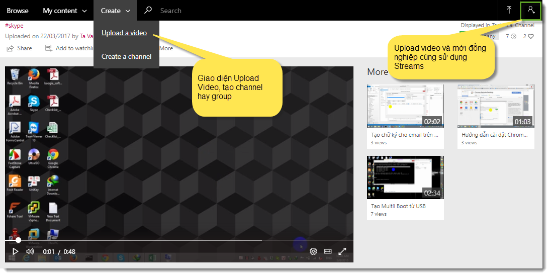 Bạn có thể upload video mới, tạo channel và group tại tab Create. Với những thao tác cực kỳ đơn giản, nhưng nó vẫn đáp ứng được nhu cầu sử dụng hệ thống chia sẻ video trong nội bộ trường. Bạn có thể mời bạn bè, đồng nghiệp cùng sử dụng qua thao tác invite your coworked trên thanh công cụ góc phải màn hình.