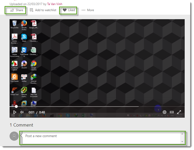 Khi xem một video, bạn có thể tương tác comment, like hoặc chia sẻ video đó đến những người đồng nghiệp khác trong tổ chức