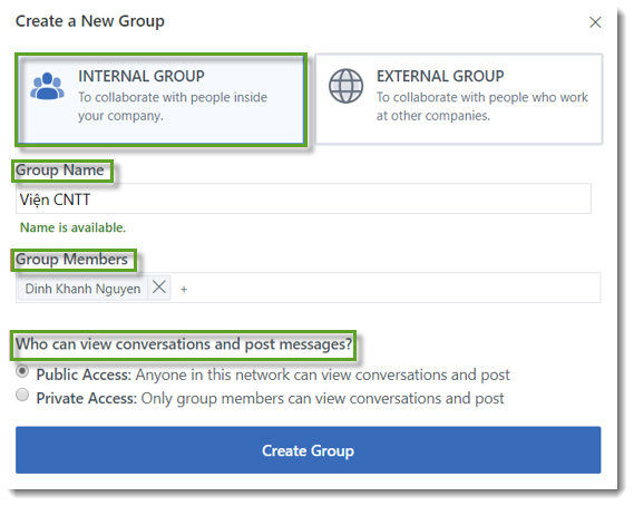 Điền các thông số thuộc tính của Yammer group: Yammer network (internal hay external), Group name, Group members, Public hoặc Private Access.