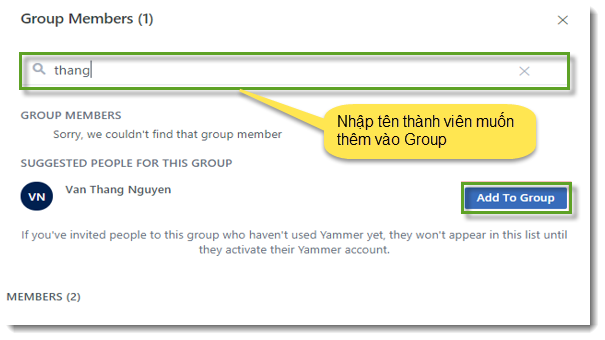 Lưu ý: Bạn chỉ có thể nhìn thấy các thành viên đã thêm vào nhóm khi họ kích hoạt tài khoản Yammer của họ.