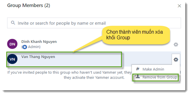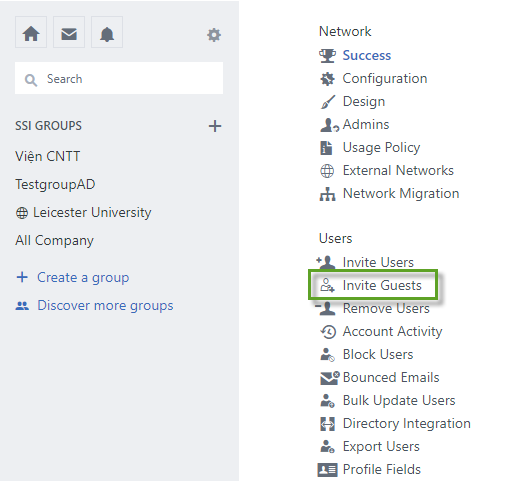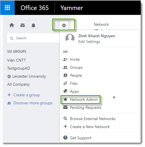Lưu ý: Chỉ có thành viên có quyền Global Admin mới có quyền Invite thành viên không thuộc tổ chức tham gia vào mạng Yammer nội bộ. Khi muốn Invite một đối tác ở bên ngoài tổ chức vào mạng Yammer nội bộ, cần liên hệ với Global Admin thuộc Trung tâm mạng thông tin để hỗ trợ.