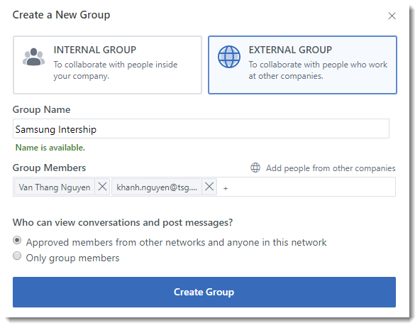 Chọn phần External Group khi tạo Group, Đặt tên cho Group, thêm các thành viên trong và ngoài tổ chức vào nhóm