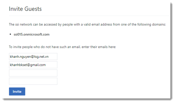 Nhập vào email của thành viên bên ngoài muốn mời vào mạng Yammer nội bộ của tổ chức và sau đó chọn nút “Invite”