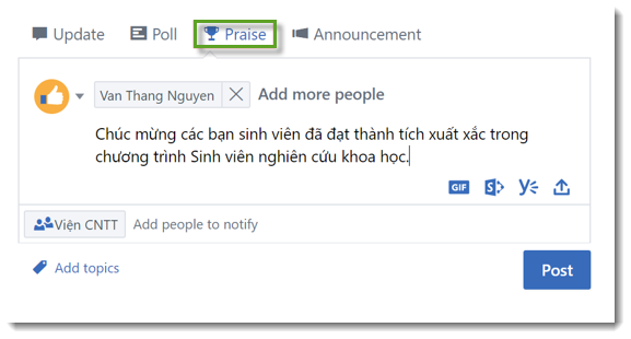 Tính năng Praise tạo một sự kiện khen thưởng, tuyên dương những cán bộ, nhân viên, sinh viên có thành tích và đóng góp xuất xắc