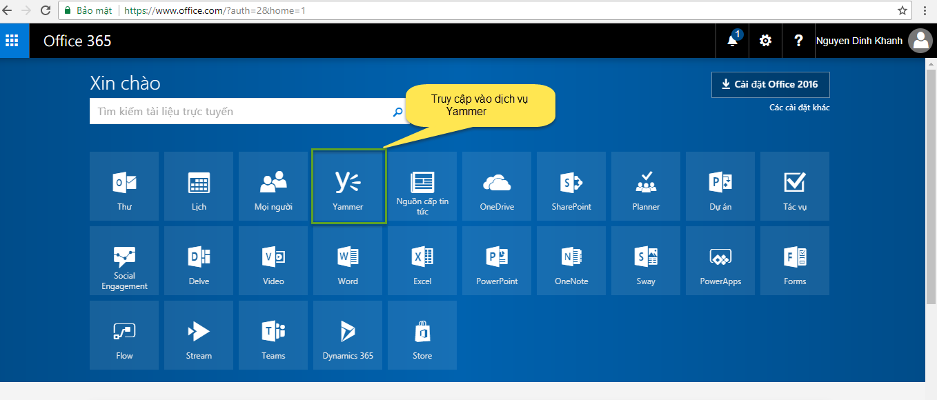 Trong giao diện Home Office 365 cá nhân, Click vào “Yammer” để vào mạng xã hội nội bộ Yammer
