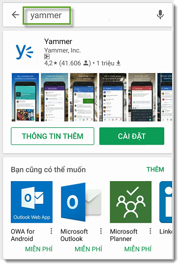 Vào CH Play (Điện thoại Android) hoặc APP Store, tìm kiếm ứng dụng Yammer và bấm nút Cài đặt