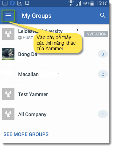 Sau khi đăng nhập ứng dụng Yammer trên điện thoại có đầy đủ các chức năng như trong giao diện Web