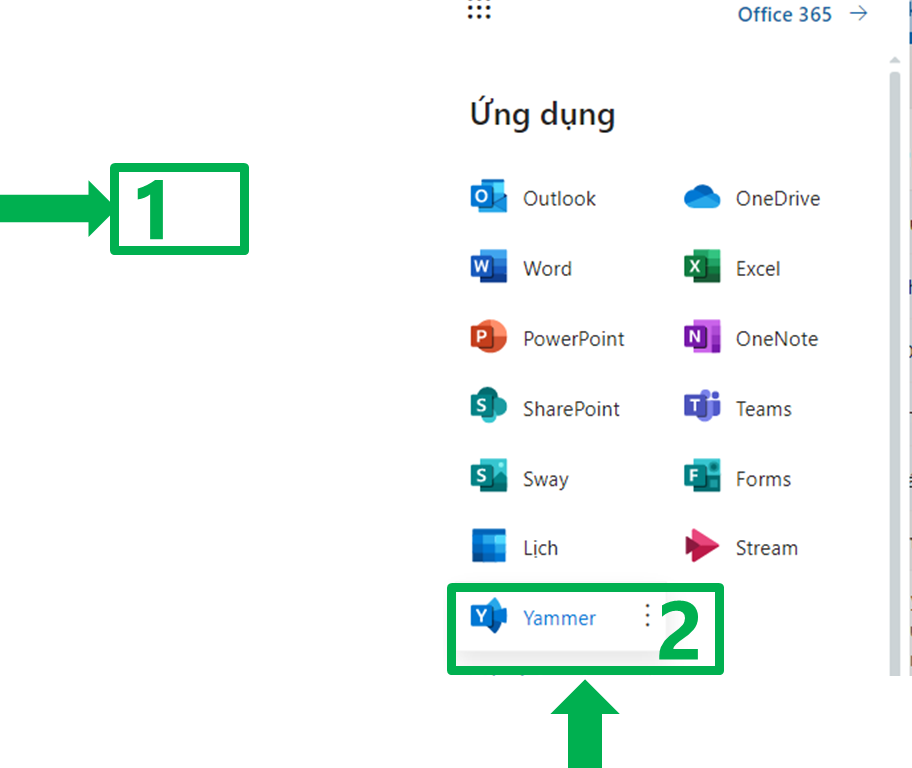 - Chọn Công cụ và khởi động ứng dụng (ở góc trên cùng bên trái màn hình) Tìm và chọn Yammer