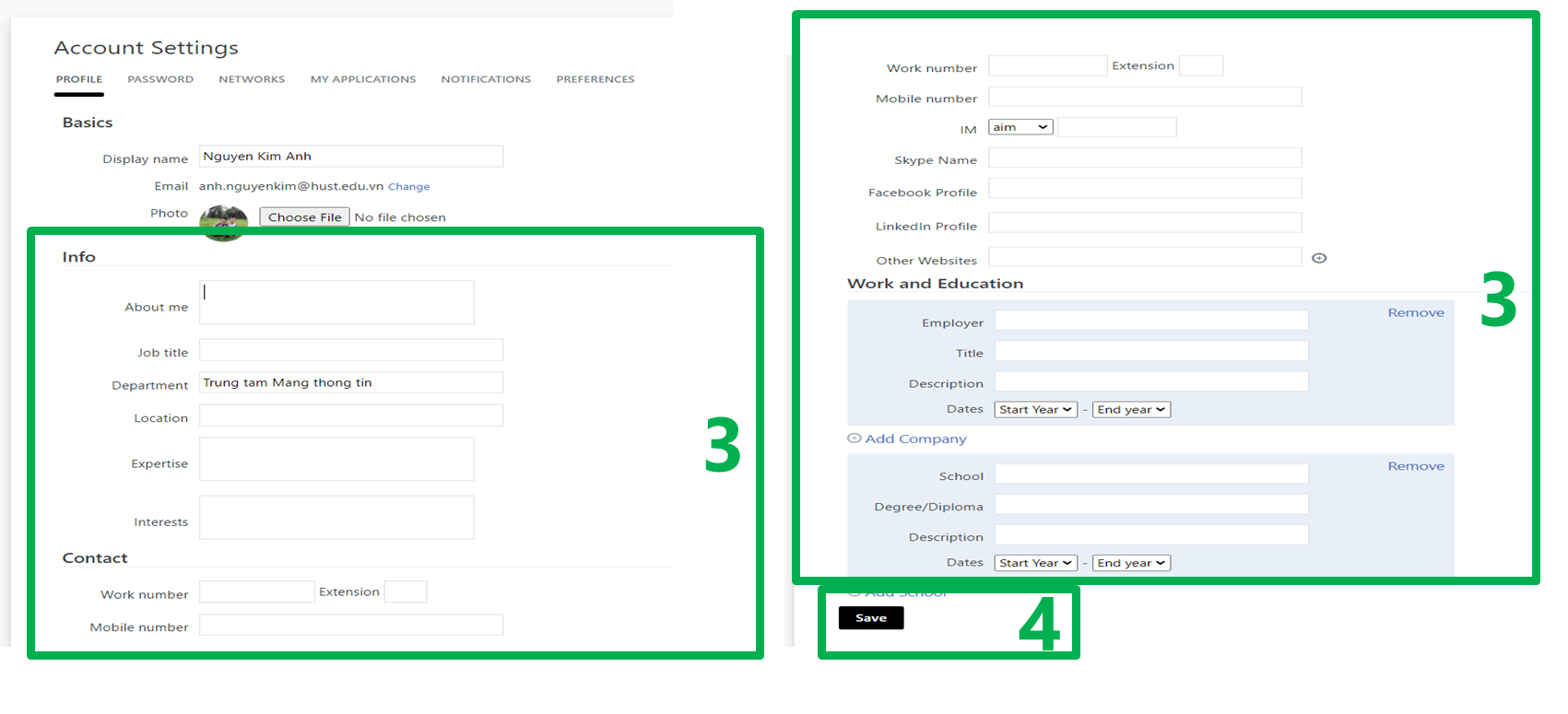 - Bước 3,4: Cập nhật trang cá nhân của mình vào các trường cần thiết: địa chỉ mail, ảnh cá nhân, số điện thoại Đơn vị công tác … Nhấn Save để lưu lại