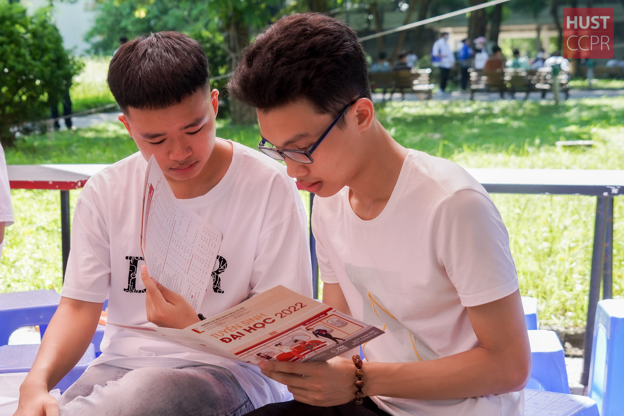 Trong không khí đông đúc phụ huynh, học sinh đến nghe tư vấn chuyên sâu tại các bàn tư vấn hội trường C1 Bách khoa, Nguyễn Hoàng Việt và Cao Đức Trung – Hai học sinh Hải Phòng ngồi thảnh thơi chuyện trò. Hỏi hai em sao không tìm các thầy cô để hỏi thông tin ngành nghề, Việt cho biết cả hai đã đỗ vào Trường CNTT Bách khoa Hà Nội theo phương thức xét tuyển tài năng.