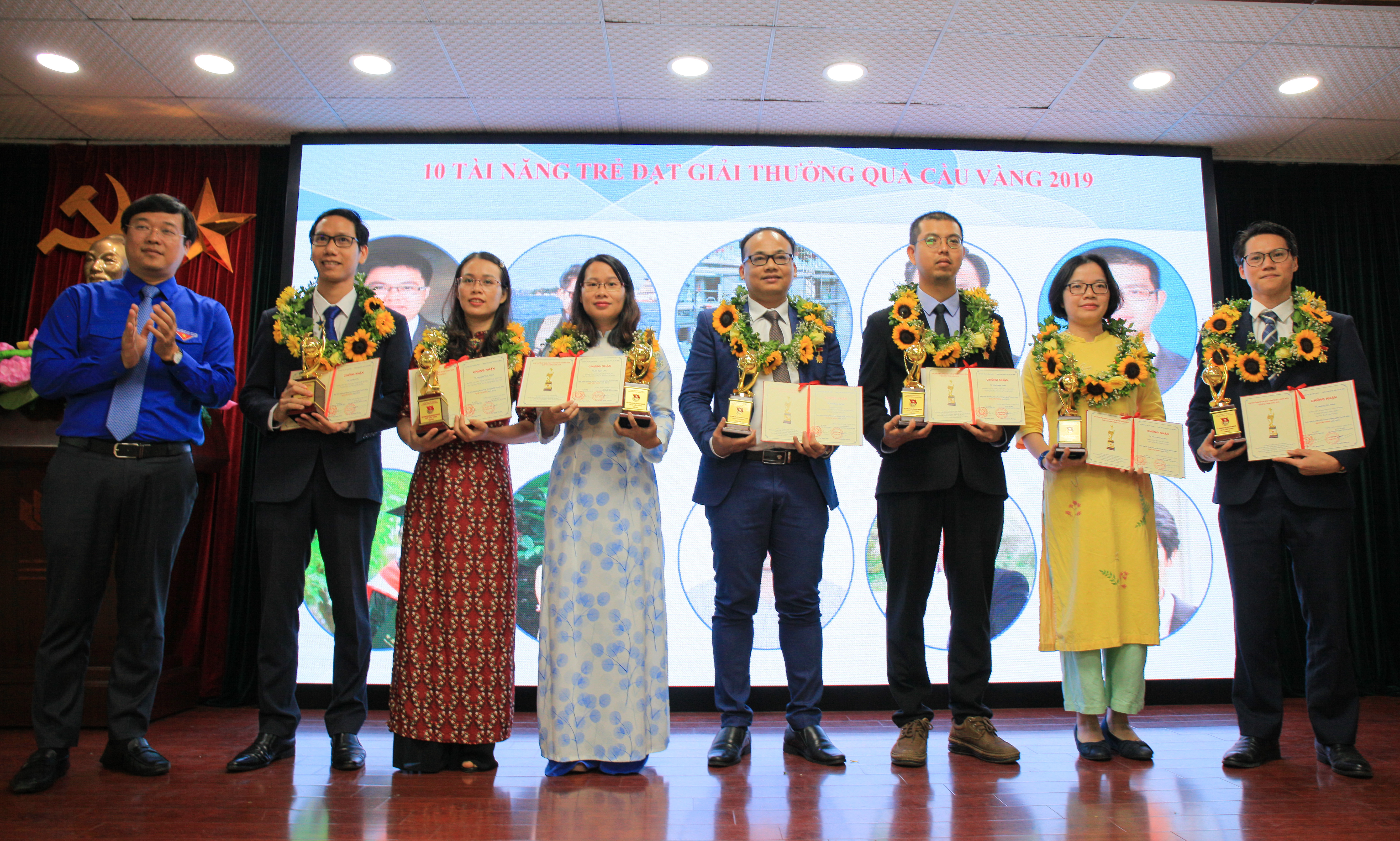 Sinh viên Hoàng Lê Diệu Hường nhận phần thưởng Nữ sinh viên tiêu biểu trong lĩnh vực Khoa học công nghệ (đứng thứ 5 từ trái sang)